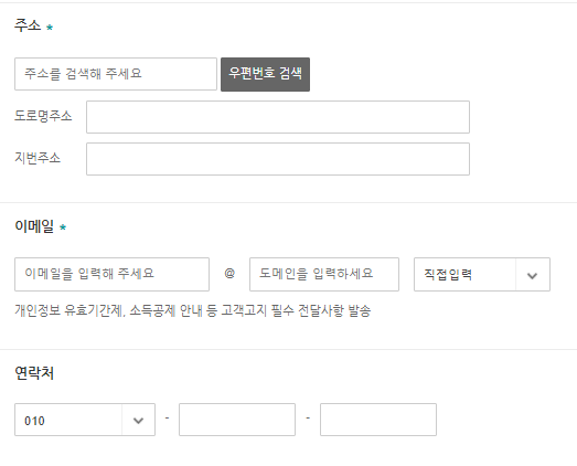 주소, 이메일, 연락처 등 연락이 가능한 정보를 입력해줍니다. 연락처 이메일은 아이디 이메일과 다른 이메일로 지정이 가능합니다.