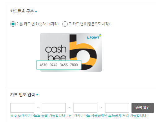 ※ pop캐시비 카드로 등록 가능합니다만 캐시비 카드 사용금액만 소득공제 처리가 가능합니다.
