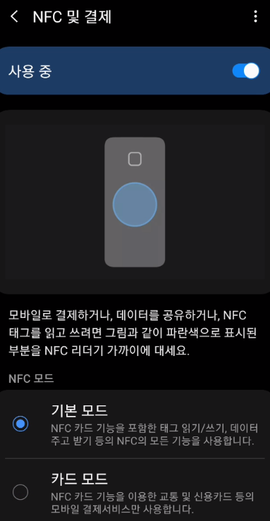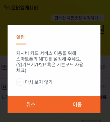 모바일 캐시비 앱 설정 : NFC 사용 중 및 기본 모드