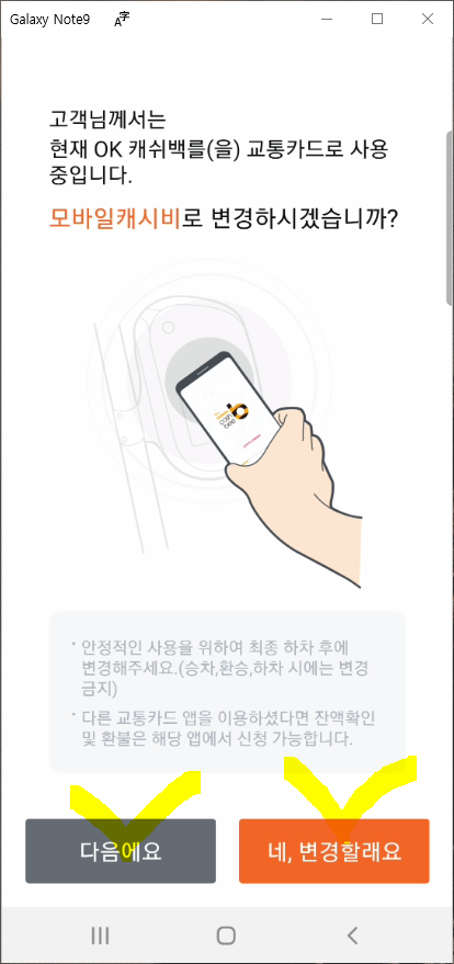 모바일 캐시비 앱을 열고 다시 "네 변경할래요"를 클릭해서 진행해보겠습니다.
