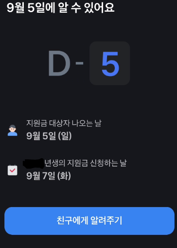 국민지원금 알림 받기 신청을 하시면 지급 대상 여부, 지급 예상 금액, 신청방법 등을 9월 5일(일요일)에 안내를 받으실 수 있으며 신청일자에도 잊지 않도록 알림을 보내주게 됩니다.