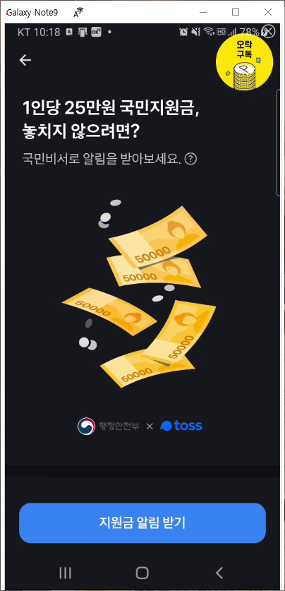 토스 코로나 상생 국민지원금 알림