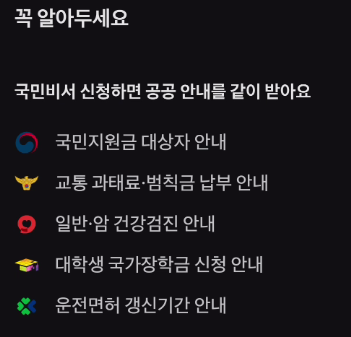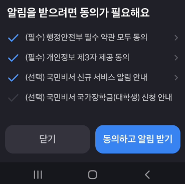 알림 수신을 위한 필수사항에 대해 모두 체크가 되어있는데 국민비서 신규 서비스 알림까지 체크되어 있기 때문에 선택사항의 체크는 빼주셔도 됩니다.