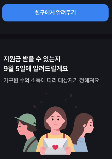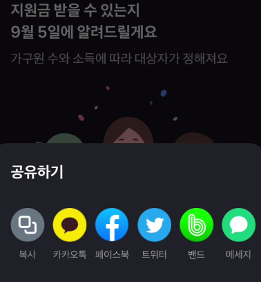 국민지원금 친구에게 알려주기 기능이 있어서 공유가 가능한 SNS 채널 등으로 전달해주시면 됩니다.