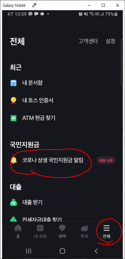 - 토스 > 전체 메뉴 > 코로나 상생 국민지원금 알림