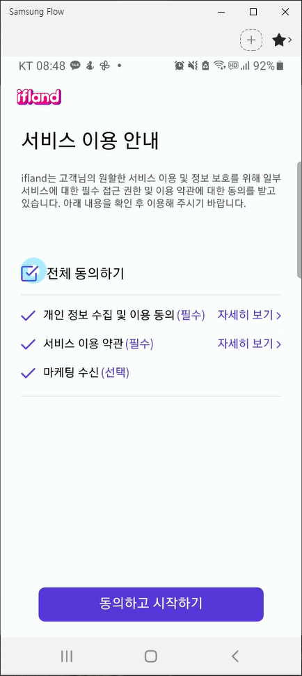 이프랜드 서비스 이용 안내 화면에서 전체 동의하기를 체크하고 하단에 보이는 "동의하고 시작하기" 버튼을 눌러주세요. 마케팅 수신 같은 선택항목은 선택할지 판단을 하셔야 합니다.