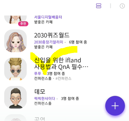아바타 아래에는 참여가 가능한 랜드(Land)들의 리스트가 보입니다. 여기서 신입을 위한 ifland 사용법과 QnA 필수...라고 보이는 랜드를 클릭해서 들어가 보겠습니다.