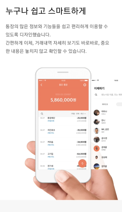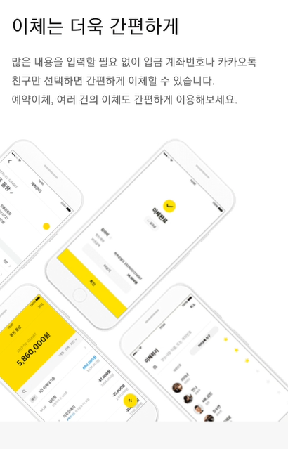 - 간편한 이체(계좌번호, 카톡 친구), 예약 이체, 다건 이체 제공.