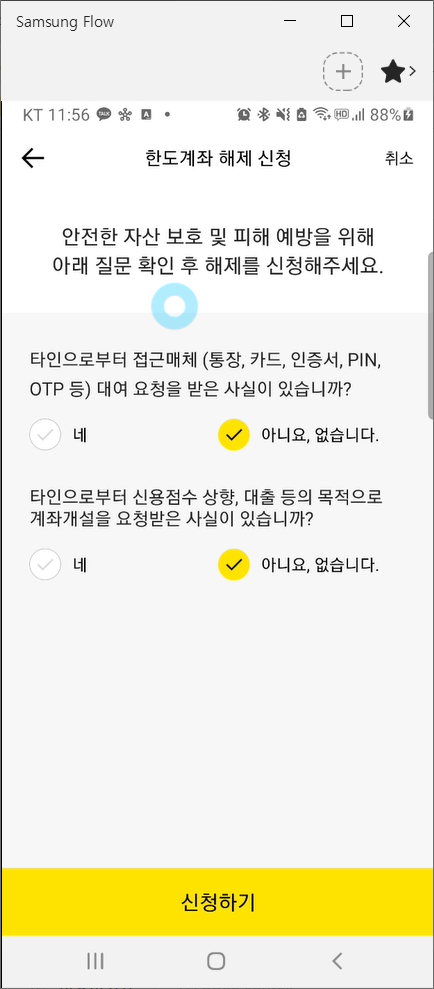 한도 계좌 해제 신청 화면에서 안전을 위해 타인에게서 요청받은 것이 있냐는 질문에는 반드시 "아니오, 없습니다."를 선택하셔야 합니다. 실제 타인이 요청한 것은 거절하셔야겠죠.