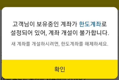 엇! 그런데 이게 무슨 일인가요? 제가 보유 중인 계좌가 한도 계좌로 설정되어 있어 계좌 개설이 불가합니다.라는 메시기가 확인됩니다.