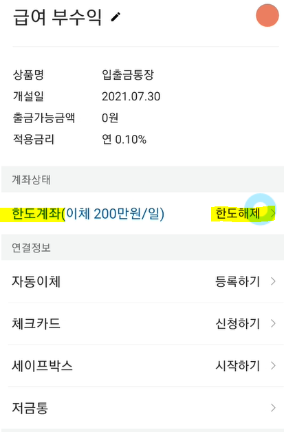 한도 계좌를 눌러서 들어간 다음 "관리" 버튼을 클릭하여 계좌관리 화면에서 "한도 해제"를 클릭해주세요.