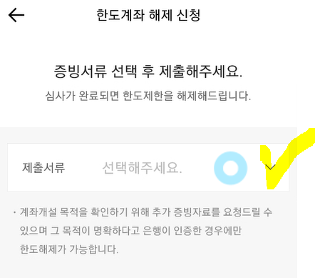 한도 해제를 클릭하면 한도 계좌 해제 신청 화면에서 다시 한도 계좌 해제 방법을 확인하라고 안내합니다. 어 이런 간단하지 않은 것 같은데요. 증빙서류 제출과 서류심사라니 제출해도 최대 3 영업일이 소요된다고 하네요.