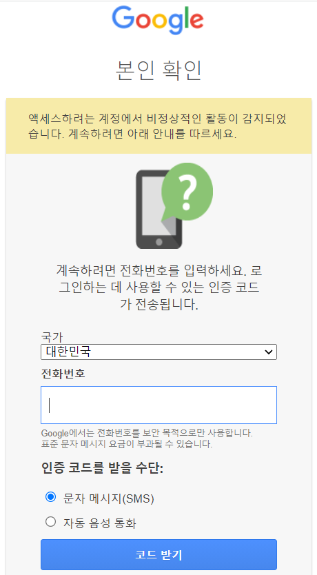 - 본인확인 --> 국가 선택(자동), 전화번호 입력 및 인증코드를 받을 수단 선택 --> 문자 메시지(SMS) 또는 자동 음성 통화 (저는 문자 메시지를 선택했음.)