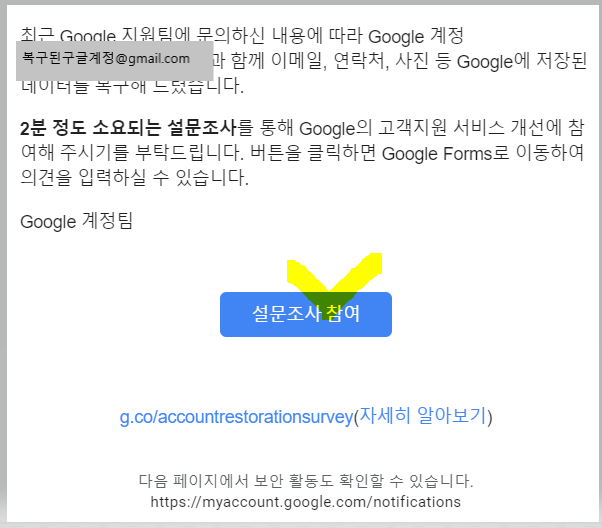 자 그럼 오늘은 구글 계정 사용 중지시 복구 조치 방법에 대해 알아보았습니다. 빨리 조치되었으니 고마움의 표시로 구글 설문조사도 완료해야 될 거 같습니다.