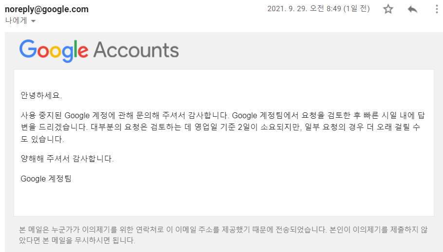 하지만 구글은 바로 중지된 구글 계정에 대해 확인할 수 있는 내용을 보내주길 요구하고 있기 때문에 바로 해당 계정이 본인 것임을 확인하는 내용을 보내주면 다음과 같은 답변을 1차로 받을 수 있습니다.