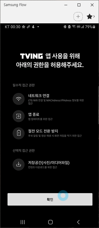 처음 티빙 앱을 실행하면 앱 사용을 위해 권한 허용이 필요합니다. 확인 버튼을 바로 눌러주세요.