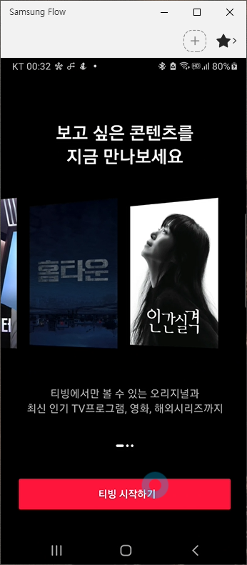 확인을 누르니 다음과 같은 티빙 시작 화면이 나옵니다. 하단의 "티빙 시작하기" 버튼을 눌러주세요.