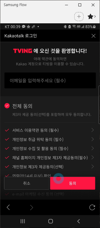 티빙에 오신 것을 환영합니다! 화면이 나오네요. 이메일은 필수이니 다시 한번 확인하시고 전체 동의 후 (선택)사항은 불필요시 제외하셔도 무방합니다.