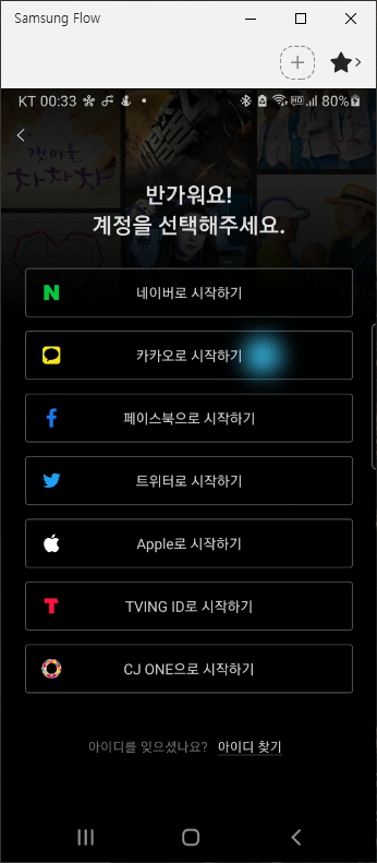 티빙 시작하기는 다시 사용할 계정을 어떤 계정과 연동해서 시작할지 결정해주셔야 합니다. 저는 카카오로 시작하기를 선택해보겠습니다.
