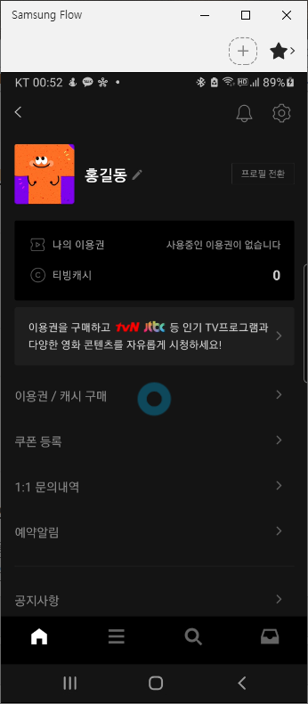 티빙 앱의 우측 상단의 (본인)계정 아이콘을 클릭하면 이용권 구매, 캐시 구매 및 쿠폰 등록 화면이 보입니다. 티빙을 이용하시려면 이용권이나 쿠폰을 구매하시거나 이벤트를 통해 받으신 쿠폰을 등록하셔야 됩니다.