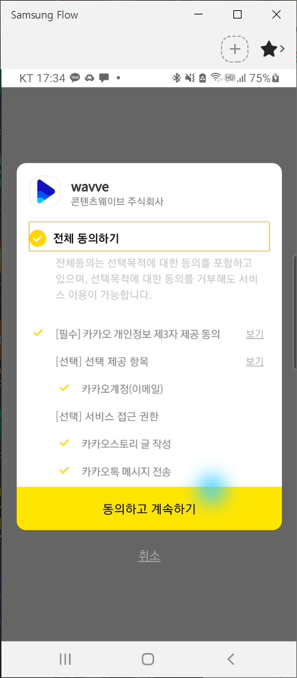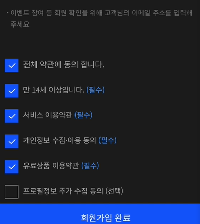 카카오로 간편로그인 하시는 경우는 다음의 화면을 참조하세요. 동의하고 계속하기로 진행하면 약관 동의 화면이 나오는데 전체 약관에 동의하시고 선택사항은 필요 없으면 체크를 제외하시고 회원가입 완료 버튼을 누르세요.