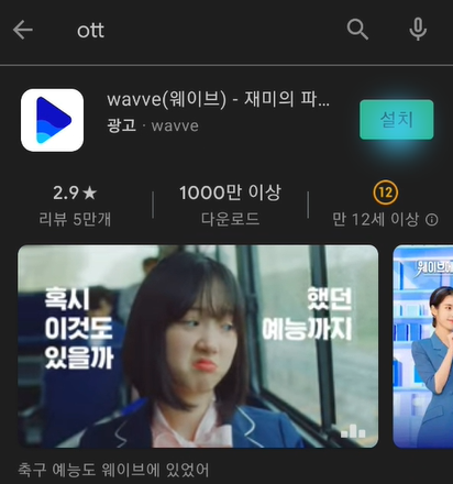 구글 플레이 또는 애플 앱스토어에서 웨이브 또는 OTT로 검색해서 웨이브 앱을 찾으세요. wavve(웨이브) - 재미의 파도를 타다!를 설치하세요.