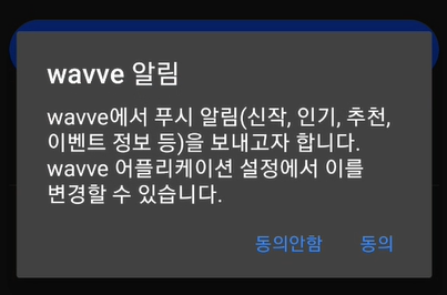 웨이브 회원가입이 끝나고 로그인을 하면 wavve 알림이 뜨실 수 있는데요. 신작, 인기, 추천, 이벤트에 대해 알림을 받으시려면 동의해주시면 됩니다.