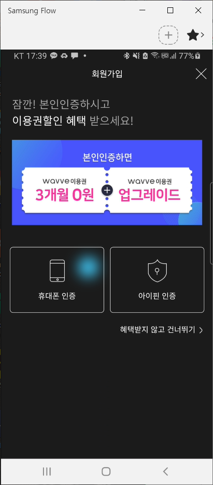 잠깐!? 본인인증하면 이용권 할인 혜택이 있다고 받으랍니다. 웨이브에서 원하니까 휴대폰 인증으로 해주도록 할게요. 휴대폰 인증은 PASS 앱으로 진행되니 자세한 내용은 생략합니다.