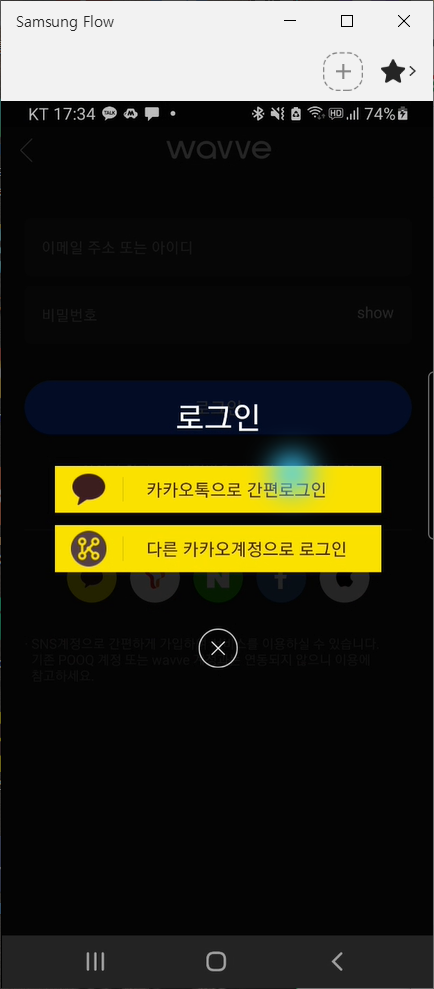 웨이브 wavve 로그인을 누르니 회원가입 또는 카카오 등으로 간편 로그인을 지원하고 있습니다. 그중 제일 간편해 보이는 카카오로 간편 로그인을 진행해보려고 합니다.