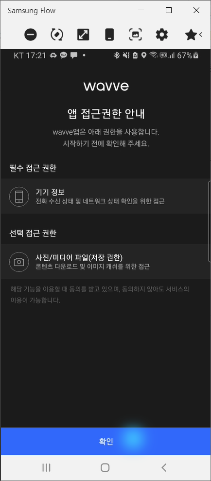 설치된 웨이브 wavve 모바일 앱을 열기 버튼을 누르면 앱 접근권한 안내 화면이 다음과 같이 보입니다. 확인만 눌러주세요. 알림 서비스는 일단 동의하고 넘어가세요.
