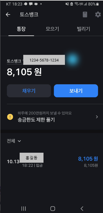 토스에서 알려준 대로 토스 머니 \8105원이 토스 뱅크로 모두 이동된 것을 토스뱅크 통장 메뉴에서 확인하실 수 있습니다.