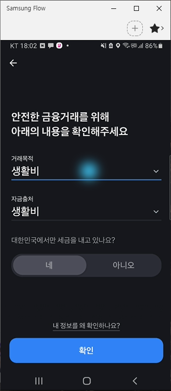 안전한 금융거래를 위해 거래목적, 자금출처 등을 선택해서 확인해주셔야 합니다.