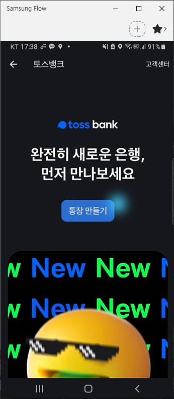 toss bank "완전히 새로운 은행, 먼저 만나보세요" 바로 아래 "통장 만들기" 버튼을 눌러보겠습니다.