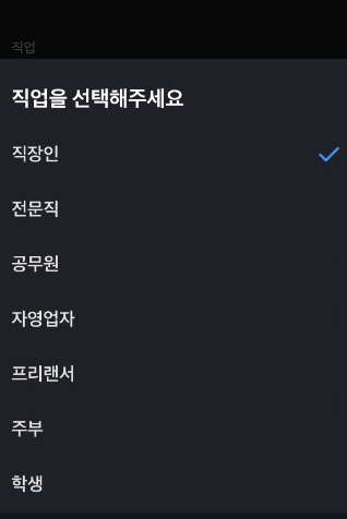 직업을 확인해주세요. 직업 리스트에서 본인 직업을 선택한 다음, 직접 사용할 계좌 개설에 "네"로 선택되어 있어야 확인 버튼 클릭이 가능합니다.