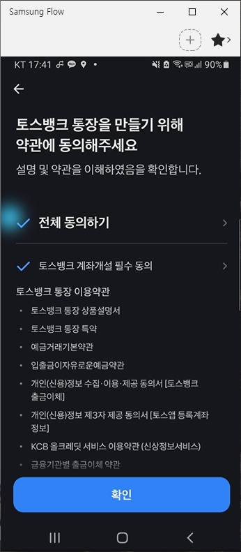 토스 뱅크 통장을 개설하기 위한 약관 동의입니다. 전체 동의하기를 체크한 후 통장 상품설명서가 보이면 확인을 눌러주시고 화면 하단에 확인 버튼을 클릭해주세요.