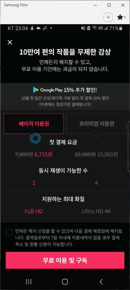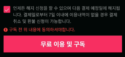언제든 해지 신청을 할 수 있다는 구독 전 내용에 동의하셔야 합니다. 체크를 하고 무료 이용 및 구독 버튼을 눌러주세요.