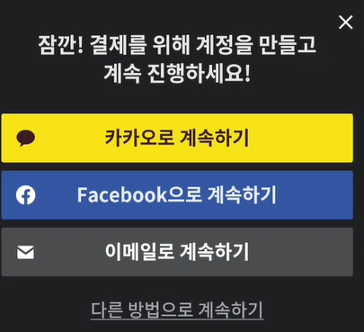 왓챠 결제 주기를 선택하면 결제를 위한 계정을 만들어야 하는데요. 저는 카카오로 계속하기로 간편하게 진행해보겠습니다.