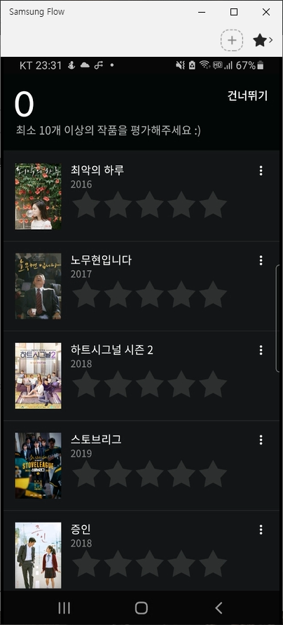 왓챠는 먼저 10개 이상의 별점이 필요해요.라고 알려주는데요. 저의 취향에 맞는 작품을 추천해준다고 합니다. 평가를 해주셔도 좋고 건너뛰기로 넘어가셔도 됩니다.