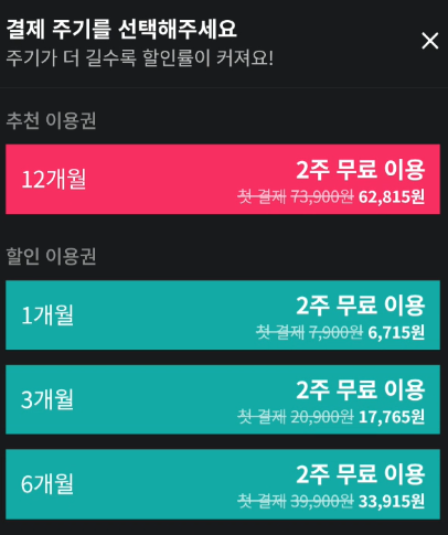 다음은 결제 주기를 선택해주세요. 12개월 추천 이용권부터 1, 3, 6개월 단위의 할인 이용권 중에서 선택해주시면 됩니다.