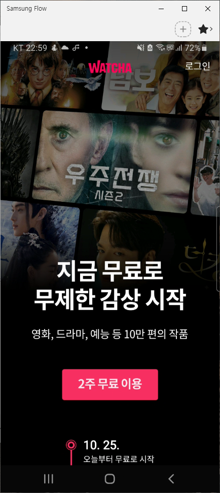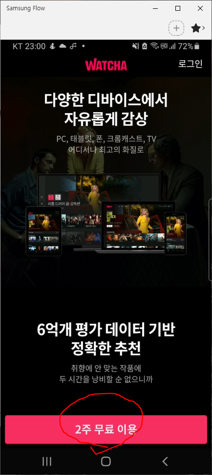 설치된 왓챠 앱을 열기를 누르면 다음과 같은 첫 시작 화면이 나타납니다. 무료 이용 기간은 2주로 해당 기간 내에 언제든 취소가 가능합니다.