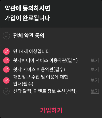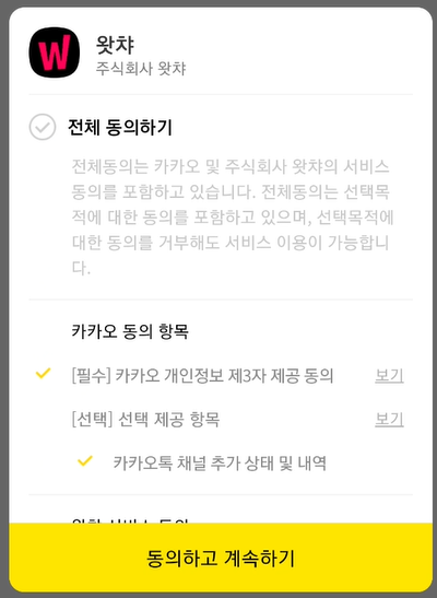 카카오톡으로 간편로그인을 누르시면 다음과 같이 왓챠 앱에 전체 동의하시를 선택하여 진행합니다. 선택 사항은 보시고 제외하셔도 됩니다.