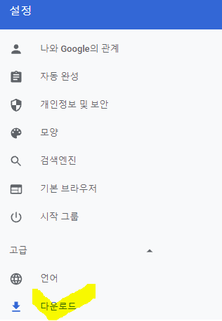 구글 크롬 설정의 메뉴 중에서 고급 - 다운로드 메뉴로 이동합니다.