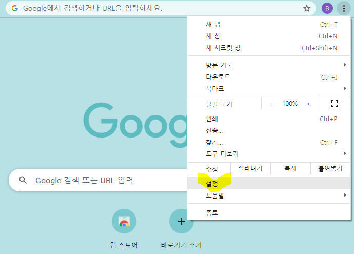 구글 크롬 브라우저 우측 상단의 더보기 아이콘을 클릭해서 설정 메뉴를 눌러줍니다.