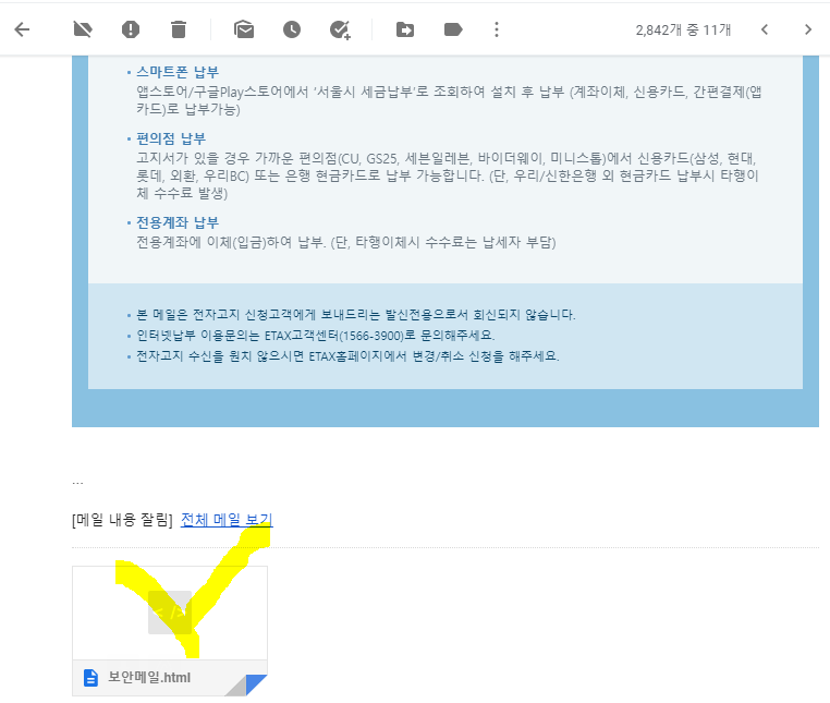 첨부 파일이 있는 이메일 하나를 열어서 첨부파일의 다운로드 아이콘을 클릭합니다.