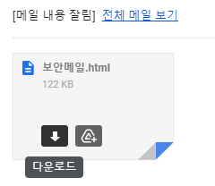 구글 이메일에서 메일을 열고 메일 본문 하단의 첨부파일을 저장해봅니다. 이메일에서 첨부파일에 마우스를 가져가면 다음과 같이 다운로드 아이콘이 보이며 클릭하면 기본 위치로 첨부파일은 저장됩니다.