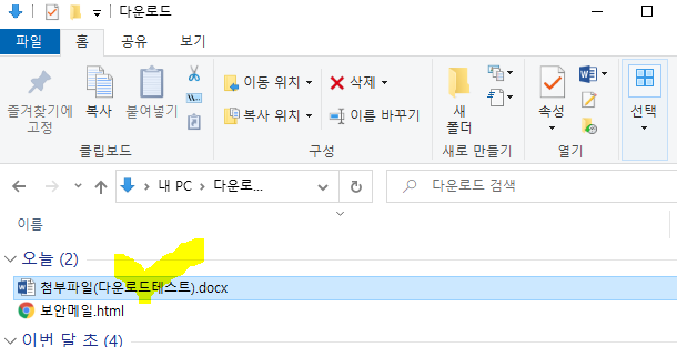 첨부파일 다운로드 아이콘을 클릭하면, 윈도우 PC의 경우 내 PC > 다운로드 폴더에 첨부파일이 저장되는 것을 확인하실 수 있습니다.