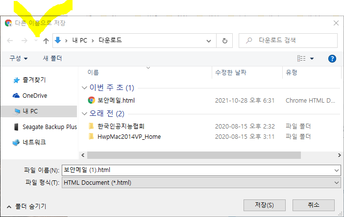 다운로드를 선택하여 클릭 시에 다른 이름으로 저장하기 위한 창이 열리는지 확인하세요. 이제 내 PC에서 원하는 폴더를 찾아 해당 파일을 저장하시면 됩니다. 더 이상 지금까지의 디폴트 저장 위치였던 내 PC > 다운로드 폴더도 바로 저장되지 않습니다.