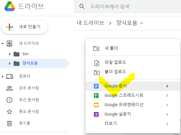 구글 드라이브에서 문서를 하나 생성한 다음 다운로드를 해보겠습니다. 먼저 구글 드라이브로 이동하고 내 드라이브 안에서 파일을 하나 생성합니다.