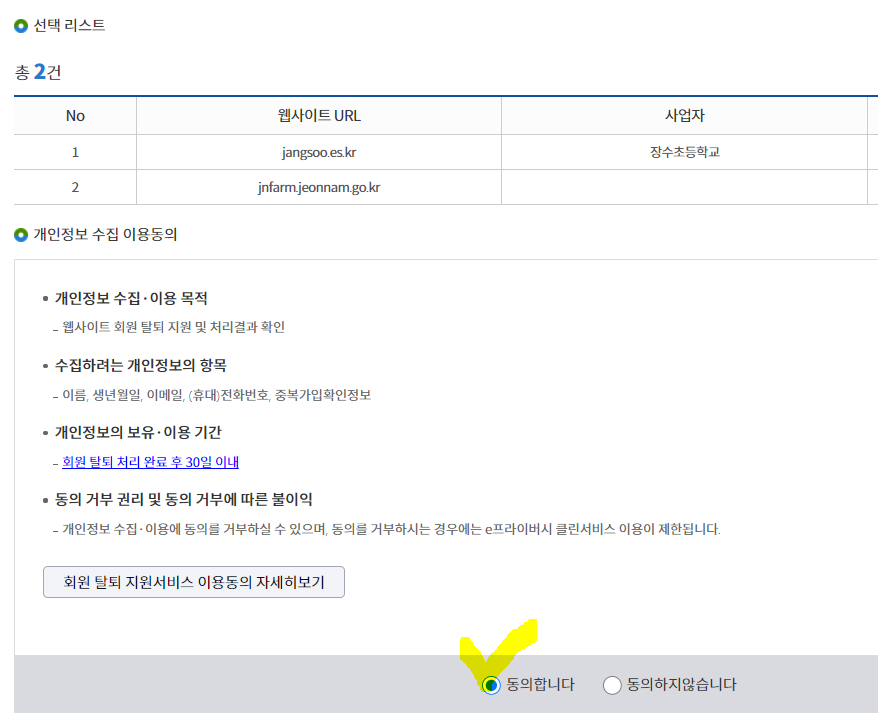 탈퇴를 선택한 리스트를 다시 한번 확인하실 수 있게 보여주고 개인정보 수집 이용 동의에 동의합니다를 체크해주시면 됩니다.