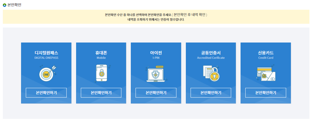 본인 확인은 본인확인 수단 중 하나를 선택하여 본인 확인을 하시면 됩니다. (디지털원패스, 휴대폰, 아이핀, 공동 인증서, 신용카드)